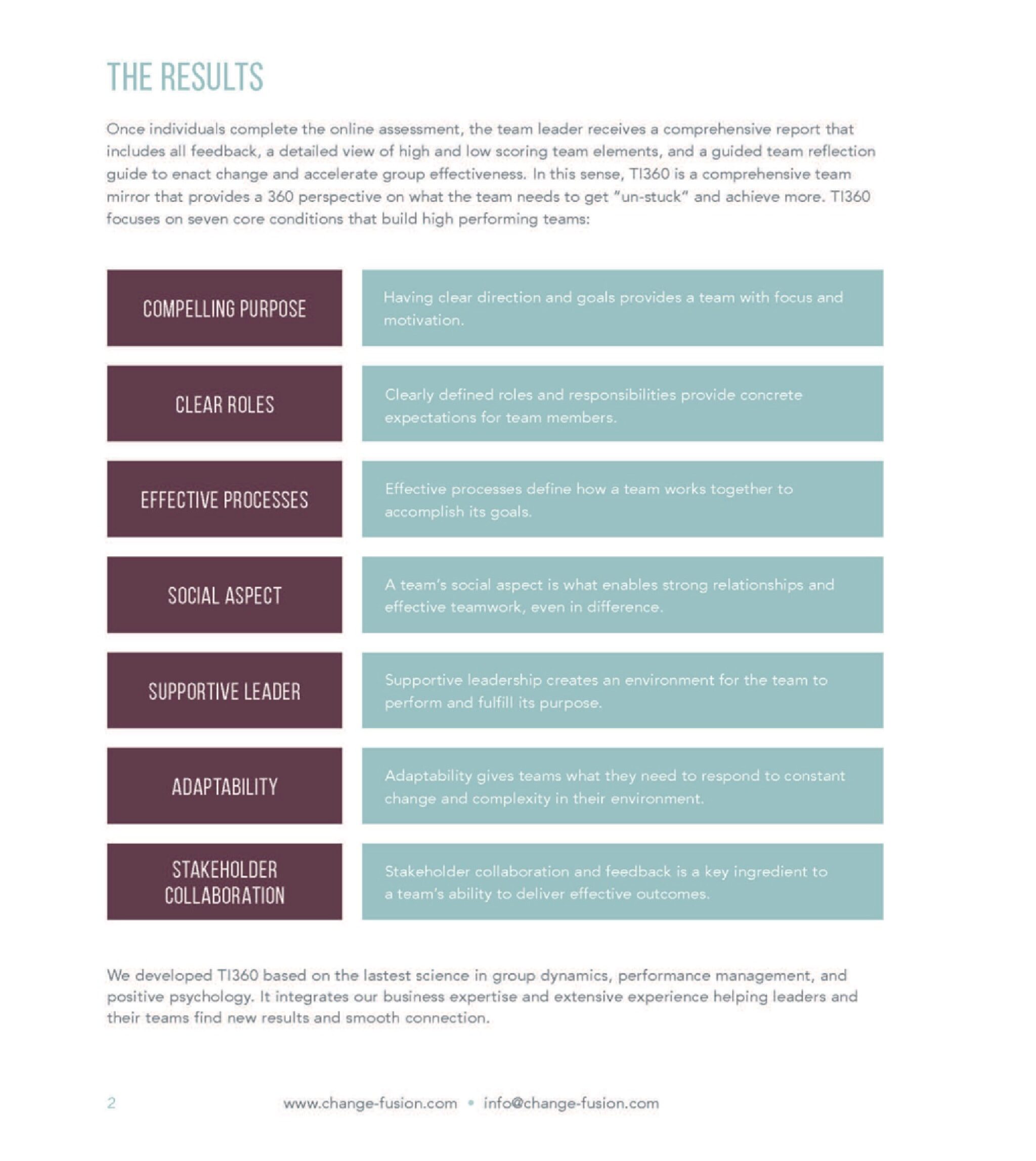 The Team Insights 360 (TI360™) is an online assessment and tool designed to build team effectiveness. It shines a light on five internal conditions for high performance and collects feedback from team members, the team leader and any relevant external stakeholders on the extent to which the team has these conditions. The assessment also explores the team’s agility and collaboration. Once individuals have all completed the assessment, you receive a comprehensive report that includes all feedback, a detailed view of high and low scoring team effectiveness elements, and a guided team reflection exercise to enact change and accelerate group effectiveness.